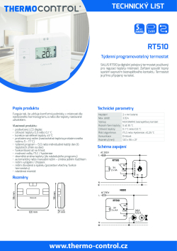 SALUS RT510 je digitálny izbový termostat používaný na reguláciu teploty miestnosti. Zariadenie spúšťa vykurovací systém zopnutím beznapäťového kontaktu. Termostat je priamo pripojený na kotol. Funguje tak, že udržuje komfortné podmienky v miestnosti podľa nastaveného harmonogramu alebo podľa teploty nastavenej užívateľom. ZÁKLADNÉ VLASTNOSTI: Podsvietený LCD displej Korekcia nameranej teploty ±3°C Protizámrzný režim Týždenný program – 5+2 alebo individuálne každý deň (6 teplotných zmien na deň) Funkcia Boost až na 9 hodín Možnosť voľby ITLC / Hysterézia Okamžitá zmena teploty (do nasledujúceho programu) vykurovanie / chladenie Režim dovolenka a spánku (pozastaví všetky funkcie termostatu) Nástenná montáž